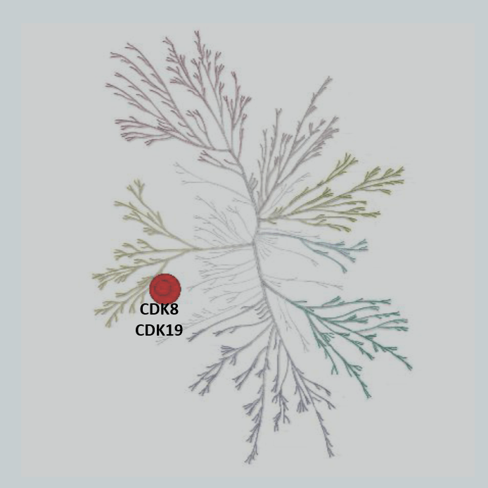 (right) CDK8/19 selectivity: effects of one of Senex’s inhibitors (tested at 2 uM) on 442 kinases. Red circles: inhibited kinases.
