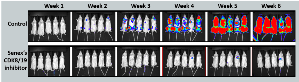 Inhibition of leukemia growth in mice by Senex’s Mediator kinase inhibitor (bioluminescence imaging)